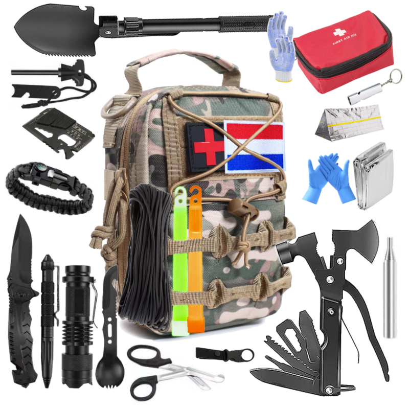 Hoe overleef je de wildernis? Nou zo! Met deze kit kom je in ieder geval een heel eind. Een schep, lightsticks, een zogenaamde spork en multi-tool, wat nog meer?